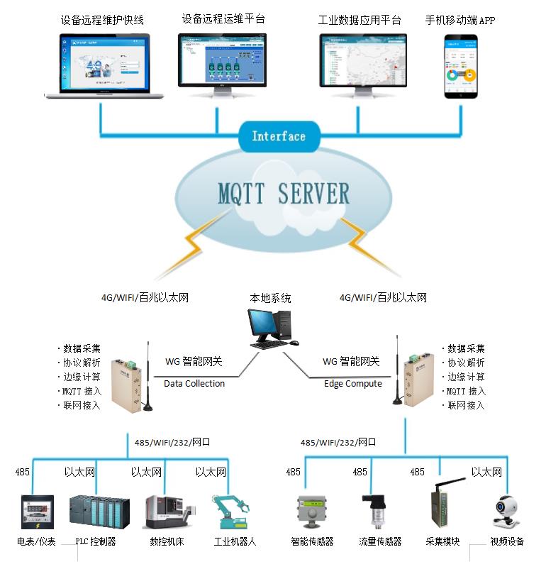 2、網關層:物通博聯PLC通信網關(支持5G/4G/WiFi/以太網),內置協議解析庫,兼容Modbus-RTU/TCP、S7、PPI、OPCUA等工業協議。