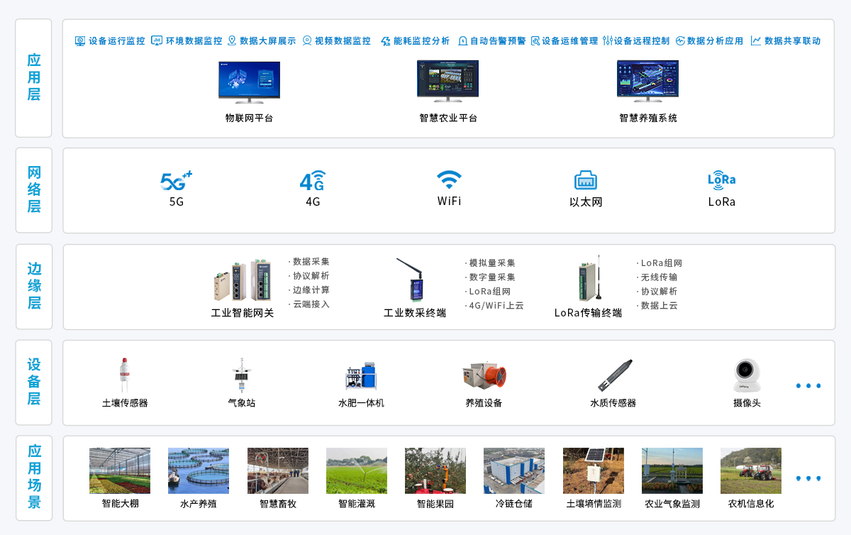 物通博聯(lián)構(gòu)建了 “終端感知 - 邊緣傳輸 - 云端中樞 - 應(yīng)用賦能” 全鏈路智慧農(nóng)牧技術(shù)架構(gòu):以工業(yè)智能網(wǎng)關(guān)、工業(yè)數(shù)字終端為核心邊緣接入層設(shè)備,實(shí)現(xiàn)對農(nóng)機(jī)作業(yè)設(shè)備(如播種機(jī)、收割機(jī)、水肥一體機(jī)等)、養(yǎng)殖環(huán)控設(shè)備(如飼喂機(jī)、通風(fēng)系統(tǒng)等)、環(huán)境監(jiān)測傳感器(如溫濕度、氨氣傳感器、光照傳感器等)等多類型終端設(shè)備的標(biāo)準(zhǔn)化數(shù)據(jù)采集與協(xié)議解析;通過穩(wěn)定的邊緣計(jì)算與網(wǎng)絡(luò)傳輸能力,將設(shè)備運(yùn)行數(shù)據(jù)、環(huán)境參數(shù)數(shù)據(jù)實(shí)時(shí)上傳至物聯(lián)網(wǎng)云平臺;在云端中樞層,依托采集的數(shù)據(jù)構(gòu)建農(nóng)牧生產(chǎn)全場景數(shù)字化看板,進(jìn)而實(shí)現(xiàn)對終端設(shè)備的遠(yuǎn)程狀態(tài)管理、異常工況自動(dòng)故障報(bào)警、設(shè)備啟停遠(yuǎn)程控制及運(yùn)行參數(shù)精準(zhǔn)遠(yuǎn)程調(diào)優(yōu),最終為農(nóng)牧行業(yè)提供從設(shè)備聯(lián)網(wǎng)到智能運(yùn)營的一體化智慧解決方案,助力傳統(tǒng)農(nóng)牧向數(shù)字化、智能化轉(zhuǎn)型。