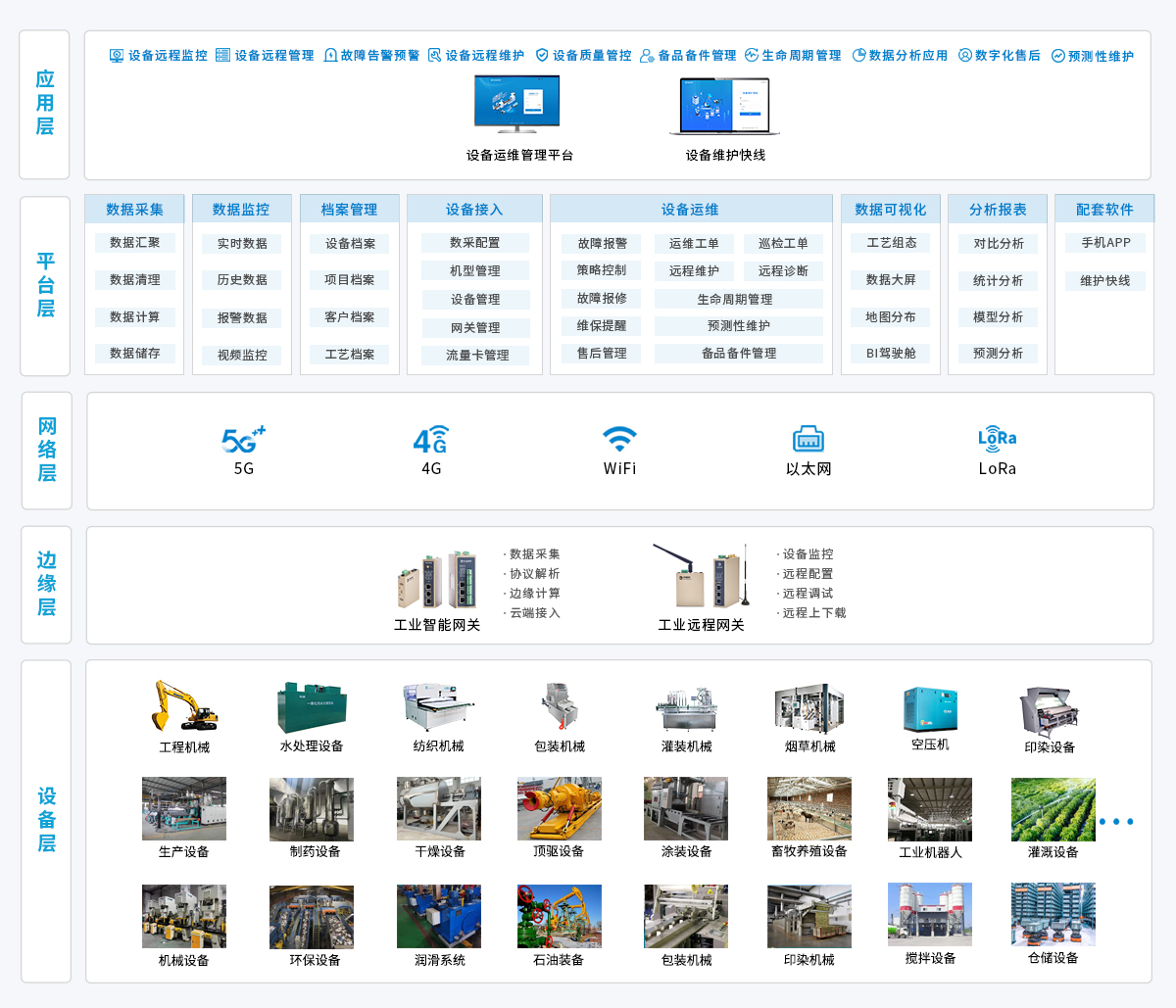 物通博聯針對設備制造商的裝備數字化需求,構建了“終端數據采集-多網融合傳輸-云端智能運維-遠程協同服務”的全周期技術解決方案:以工業智能網關為核心,采集裝備運行參數、運行狀態等數據,通過 5G/4G/WiFi/ 以太網等方式將標準化數據實時上傳至設備運維管理平臺。平臺借大數據分析與故障診斷算法,實現數據監控、趨勢預測與異常識別,設備存故障風險時自動觸發預警。依托設備維護快線,可遠程完成程序上下載、參數調試等操作,提升維護效率、降低運維成本,助力設備制造商實現裝備全生命周期數字化管理。