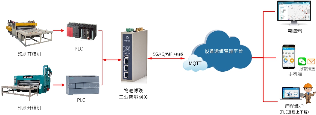 通過實現印刷開槽機的數據采集與遠程運維,設備制造商能夠實現對全國范圍內設備的遠程監控和集中管理,及時響應并解決設備故障,保障客戶生產的連續性和穩定性;同時還能不斷優化產品設計和運維策略,提升經營效益和服務質量,推動企業的高質量發展。
